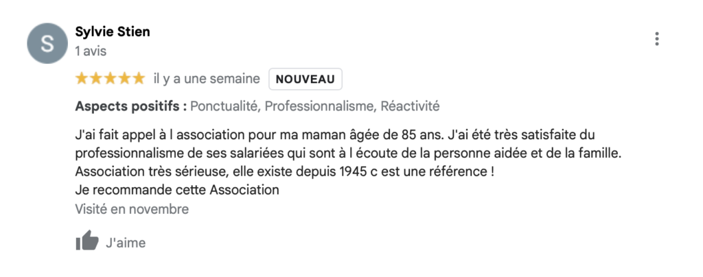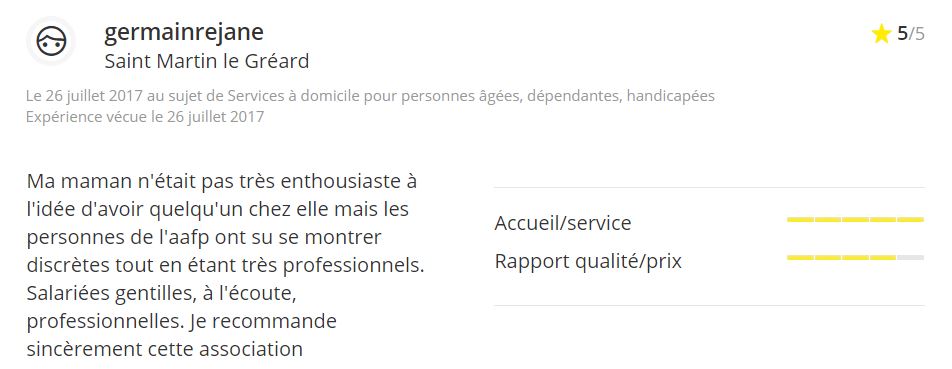 “Je tiens personnellement à remercier l’AAFP pour sa souplesse des horaires et le grand professionnalisme du personnel. En effet, ces femmes sont qualifiées et sont à l’écoute des personnes âgées comme ma mère. Le compte-rendu journalier effectué sur le cahier de liaison est une très bonne chose, à poursuivre car il nous permet de suivre le comportement de ma mère au quotidien. Je recommande sincèrement cette association aux personnes pouvant en bénéficier”. – Marc