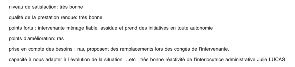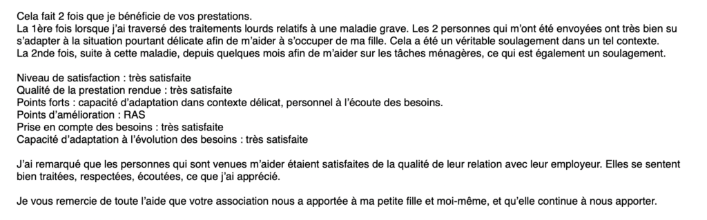 “Je suis tout à fait contente et satisfaite des intervenantes qui viennent 2 fois par semaine chez moi. J’apprécie tout particulièrement que vous ne changez pas celles-ci. Elles sont adorables avec moi ; je peux parler avec elles (je suis très seule chez moi et ne sors pas beaucoup) quand elles arrivent chez moi, puis elles entretiennent mon appartement au niveau du ménage.